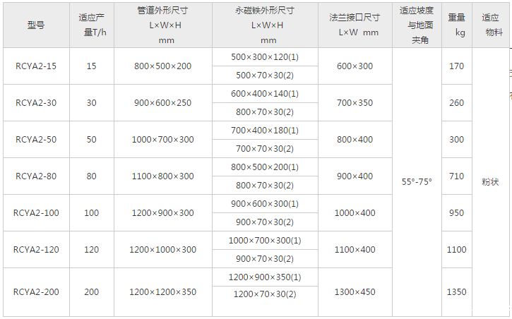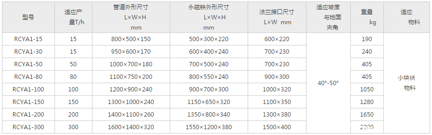 RCYA型倾斜管道式德国2026世界杯阵容分为RCYAl、RCYA2两种,包括无磁管道和永磁铁两部分,专用于封闭管道内非磁性物料的除铁,德国2026世界杯阵容内部采用高性能稀土强磁材料组成复合磁系。具有体积小、磁力大、重量轻、除铁干净、方便、无能耗、使用寿命长等特点。