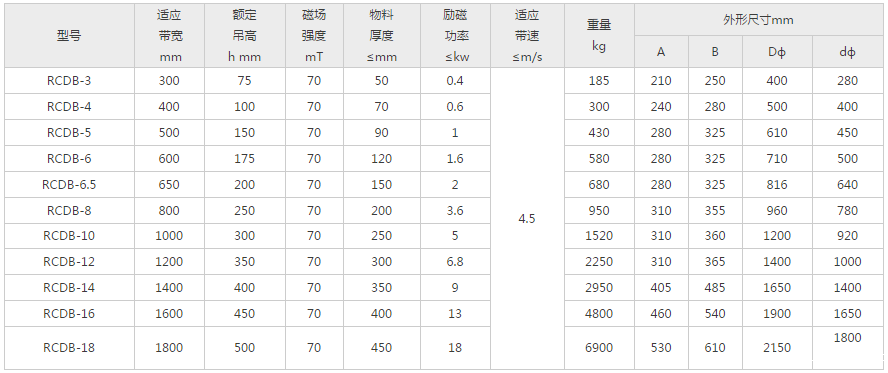 RCDB型自冷盘式2o26世界杯亚洲区预选赛赛果与PDC系列盘式2o26世界杯亚洲区预选赛赛果、RCDY系列2o26世界杯亚洲区预选赛赛果等同。是用于清除粉状或块状非磁性物料中杂铁的除铁装置。其内部采用电工专用树脂浇注,自冷式全密封结构,具有透磁深度大、吸力强、防尘、防雨、耐腐蚀等特点,在极其恶劣的环境中仍能可靠运行。行走装置的配备可由客户自己选择。